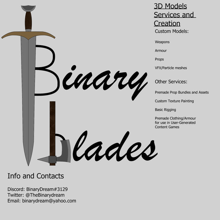 Binary Blades is a freelance commission and resource service for digital clothing, body bases, armour, weapons and props for use in User Generated Content games such as VRChat, ChilloutVR, NeosVR, and Blade and Sorcery mods. The assets provided are also available for use in game development.The products provided will have a low polygon count and UVs set to capture high detail to maximize performance whilst also providing high detail and meeting specifications as necessary. Design sizing and proportions for handheld props and weaponry are ergonomically designed for the sake of realism and to prevent clipping through the hand (therefore increasing the appearance quality in the final renditions), using historical arms replicas as a basis for sizing and proportion.I, Binarydream, aim to keep my customers well informed on the progress of commissions or projects and plan to work closely with them to create a product that's ergonomic, thematic and abides to specifications, and ultimately satisfies them.You will find prefabs and packs on my Gumroad along with progress reports on new products.For custom designs and textures, please use the email address or Discord ID provided above and read the Commission Info and Pricing. Please refer to my Gallery for previous work pieces and designs done as commissions or personal projects.